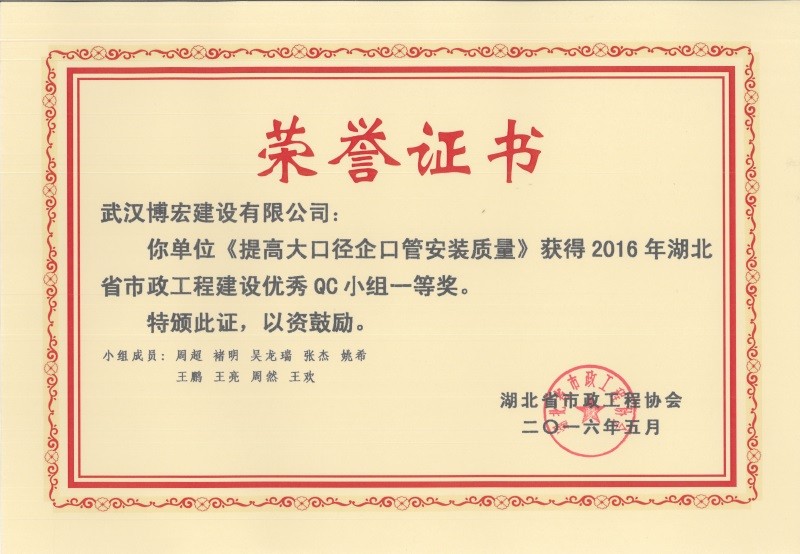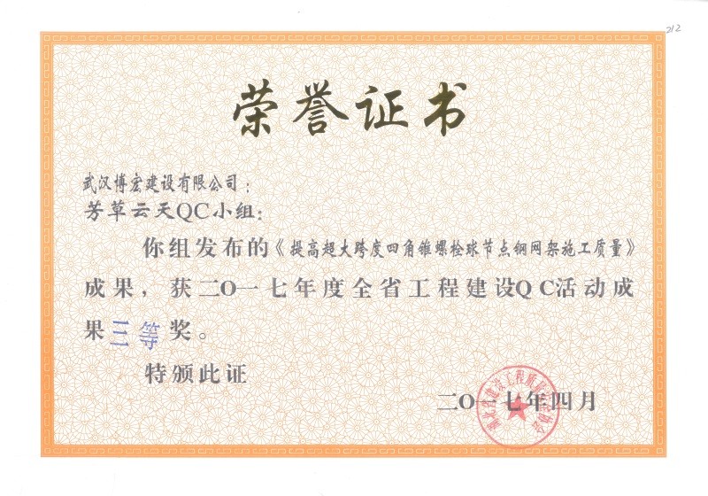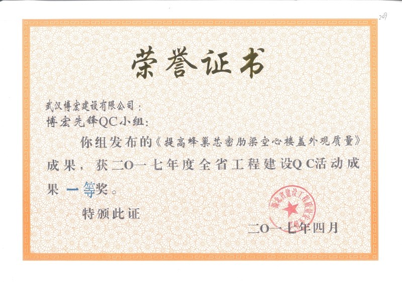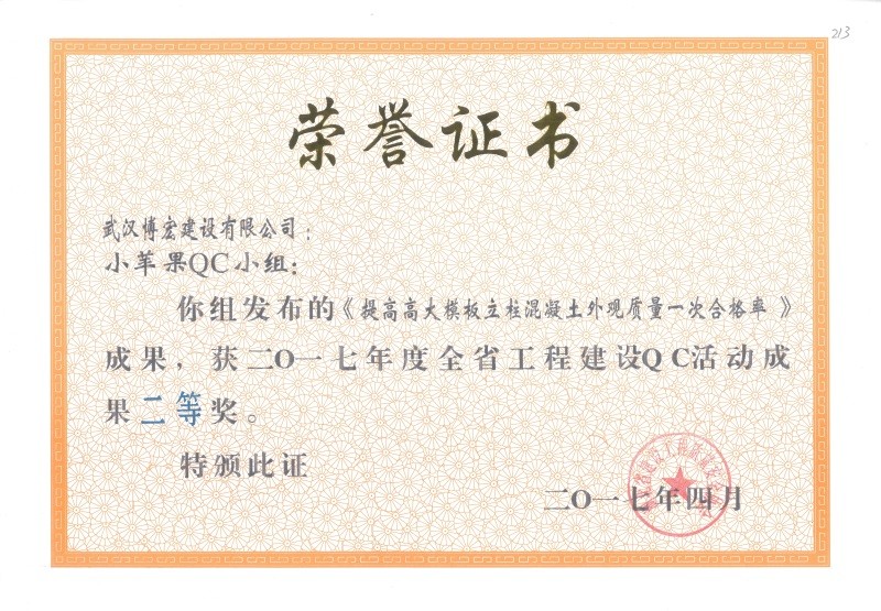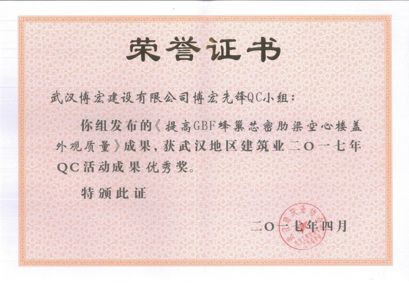 2017年武漢市地區(qū)建筑QC活動(dòng)成果優(yōu)秀獎(jiǎng)(博宏先鋒小組)