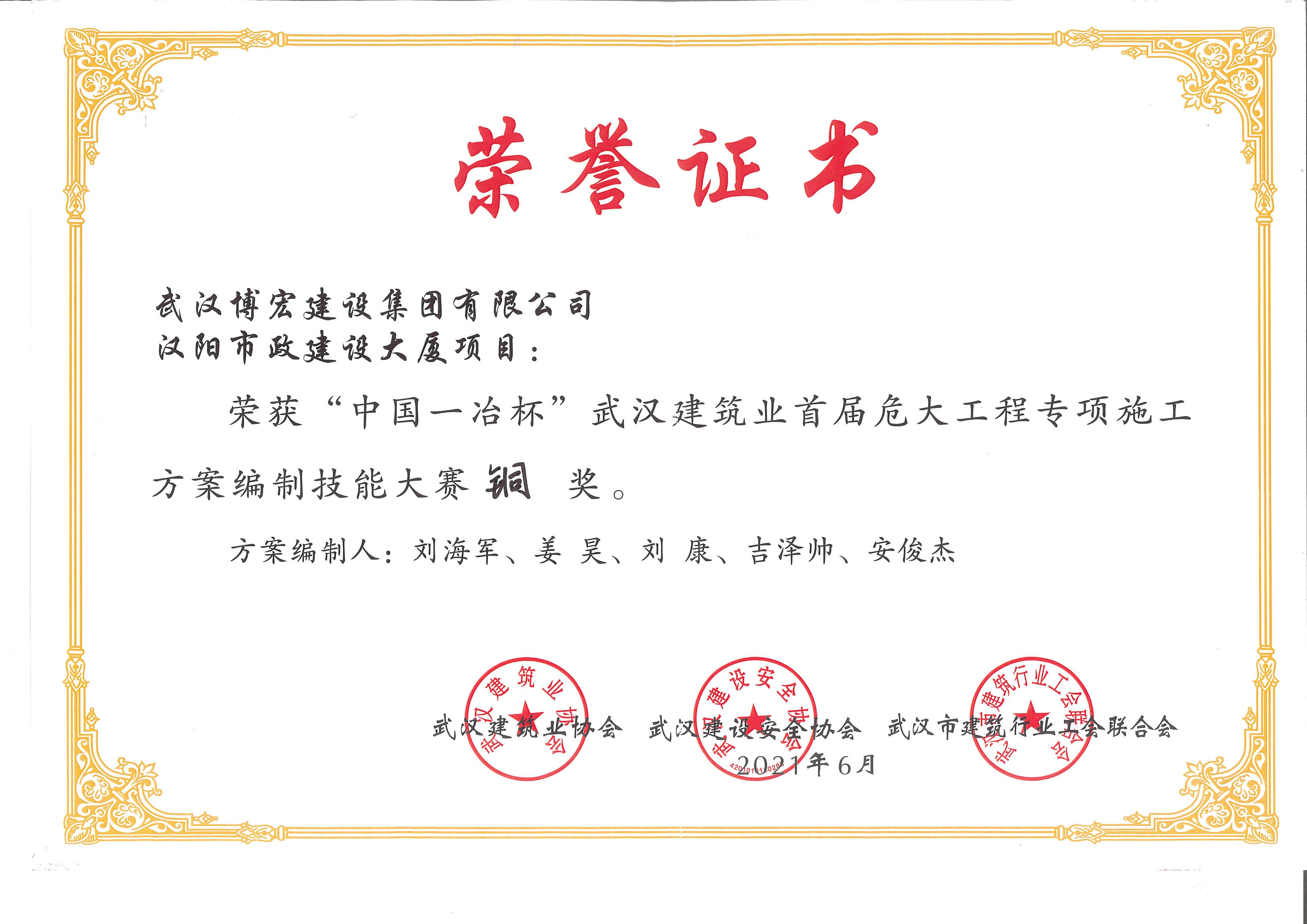 中國一冶杯武漢建筑業(yè)首屆危大工程專項(xiàng)施工方案編制技能大賽銅獎(jiǎng)