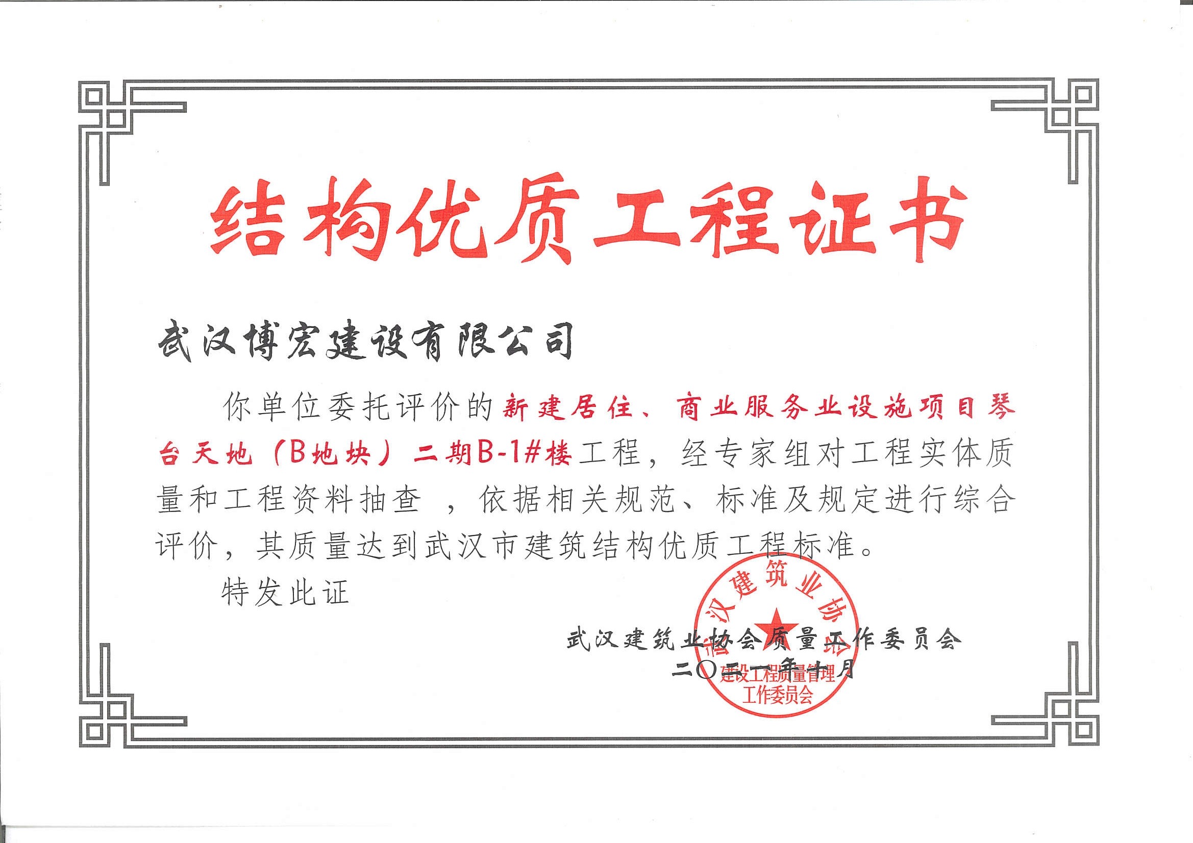 琴臺(tái)天地(B地塊)二期B-1#樓武漢市建筑結(jié)構(gòu)優(yōu)質(zhì)工程