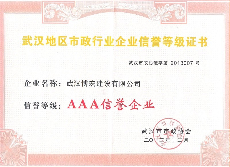 2013年度武漢地區(qū)市政行業(yè)企業(yè)信譽等級證書
