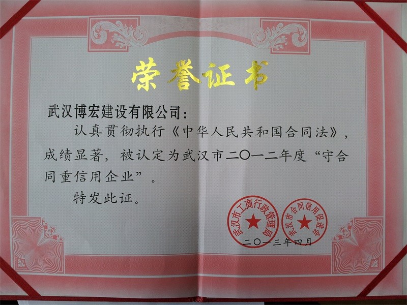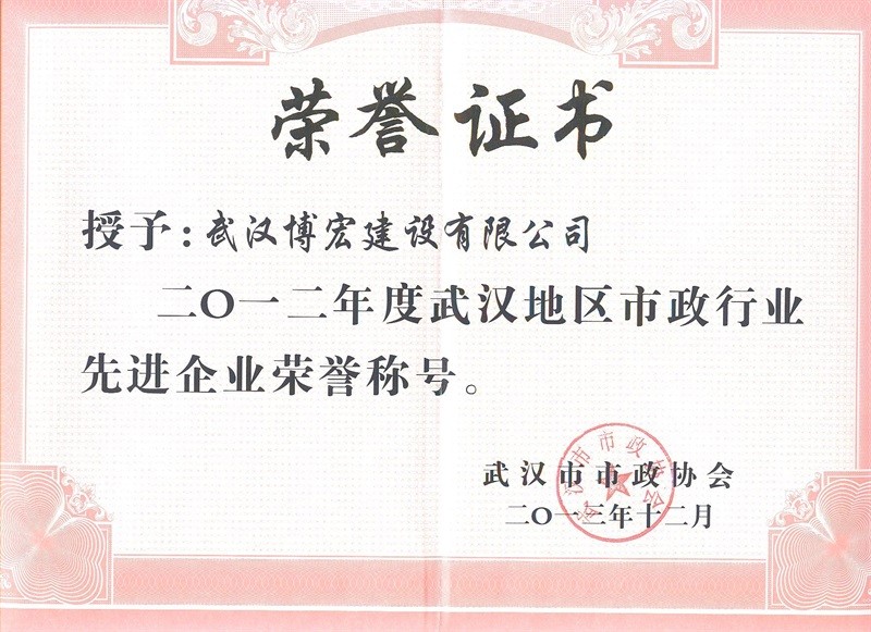 2012年度武漢地區(qū)市政行業(yè)先進企業(yè)榮譽稱號