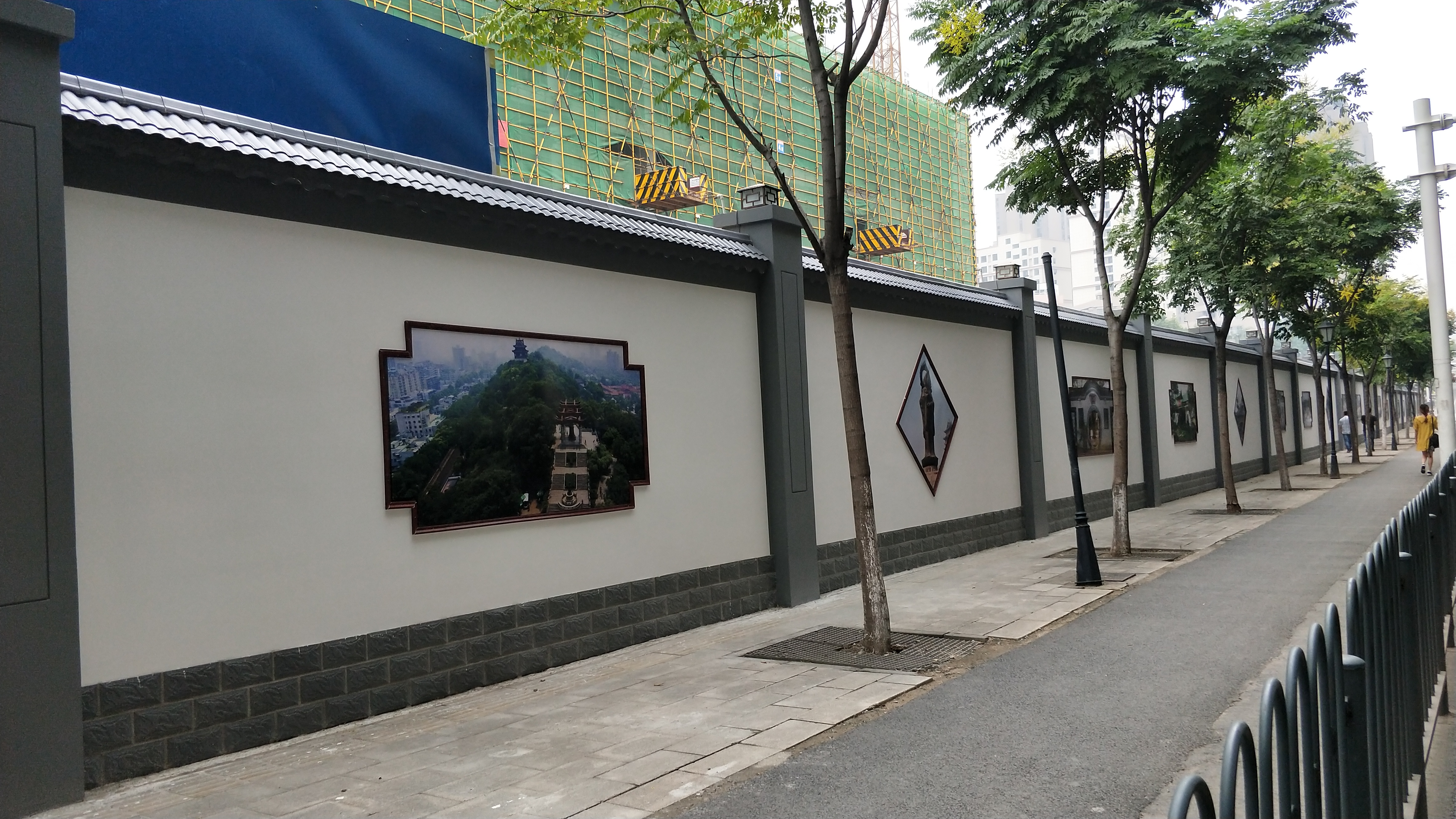項目建設(shè)伊始便針對現(xiàn)場安全文明布置采取了專項措施,按照楚天杯的標(biāo)準(zhǔn)實施建設(shè)。工地圍墻方面,項目施工現(xiàn)場多采用磚砌體圍墻與“古典中國風(fēng)”裝飾,裝飾材料均采用環(huán)保節(jié)能材料,高度高于2.5m,墻體安全牢固無破損,且進(jìn)行了美化、亮化、彩色噴繪畫面及裝訂古典園林建筑畫框妝點。定期對宣傳墻、圍擋進(jìn)行檢查、清洗和刷新。有歪斜破損的及時更換,保證其干凈、整潔、無亂涂、亂寫、亂張貼現(xiàn)象。