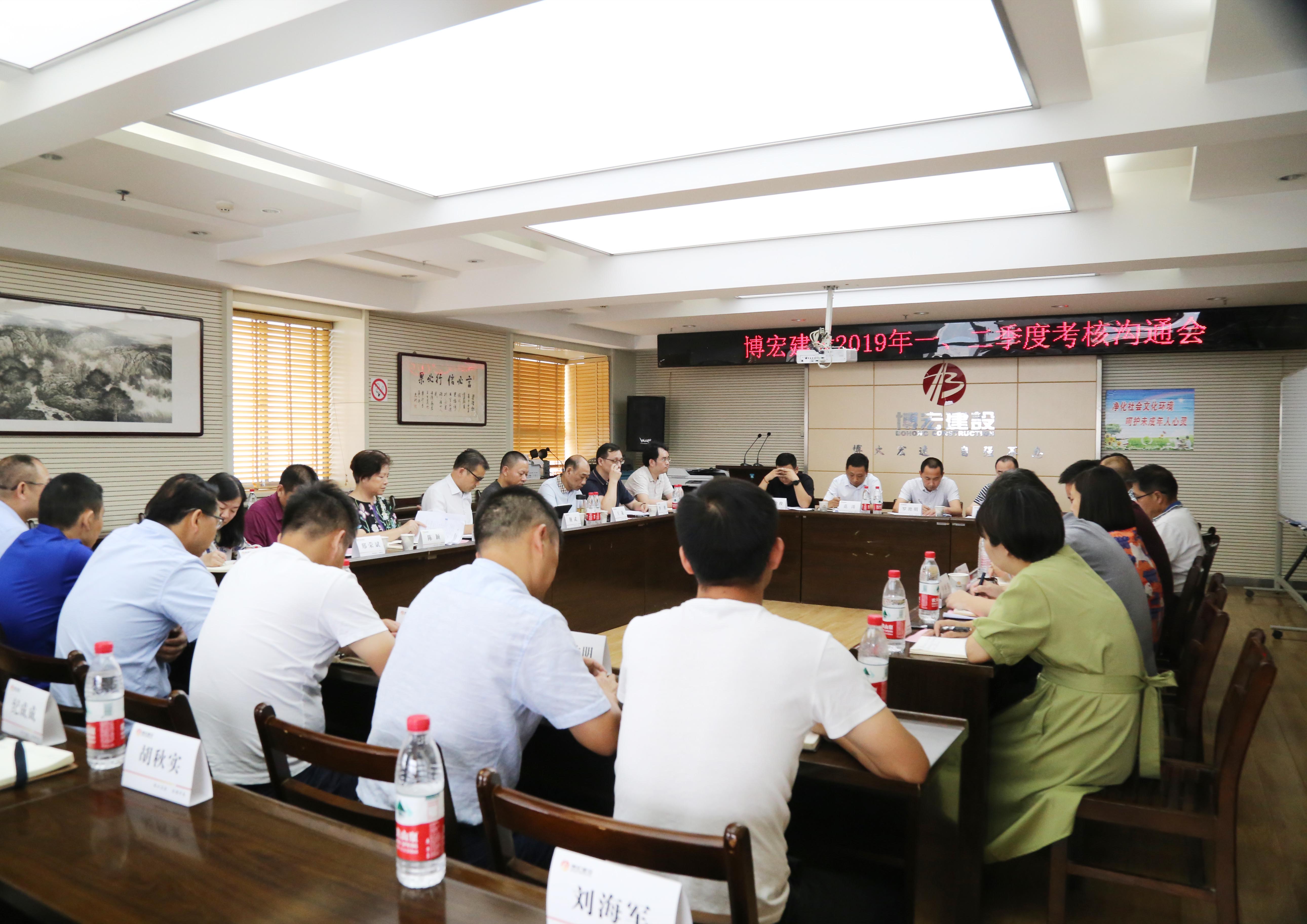 ?????????? 7月9日下午2:30,公司2019年一、二季度考核溝通會順利召開,會議就博宏建設(shè)上半年考核工作目標(biāo)完成情況進行了分析和交流,并就下半年工作思路進行進一步明確。漢陽市政集團公司黨委班子、各科室負(fù)責(zé)人、博宏建設(shè)支部班子、各部門負(fù)責(zé)人、項目經(jīng)理及技術(shù)負(fù)責(zé)人共計40余人參加了此次會議。