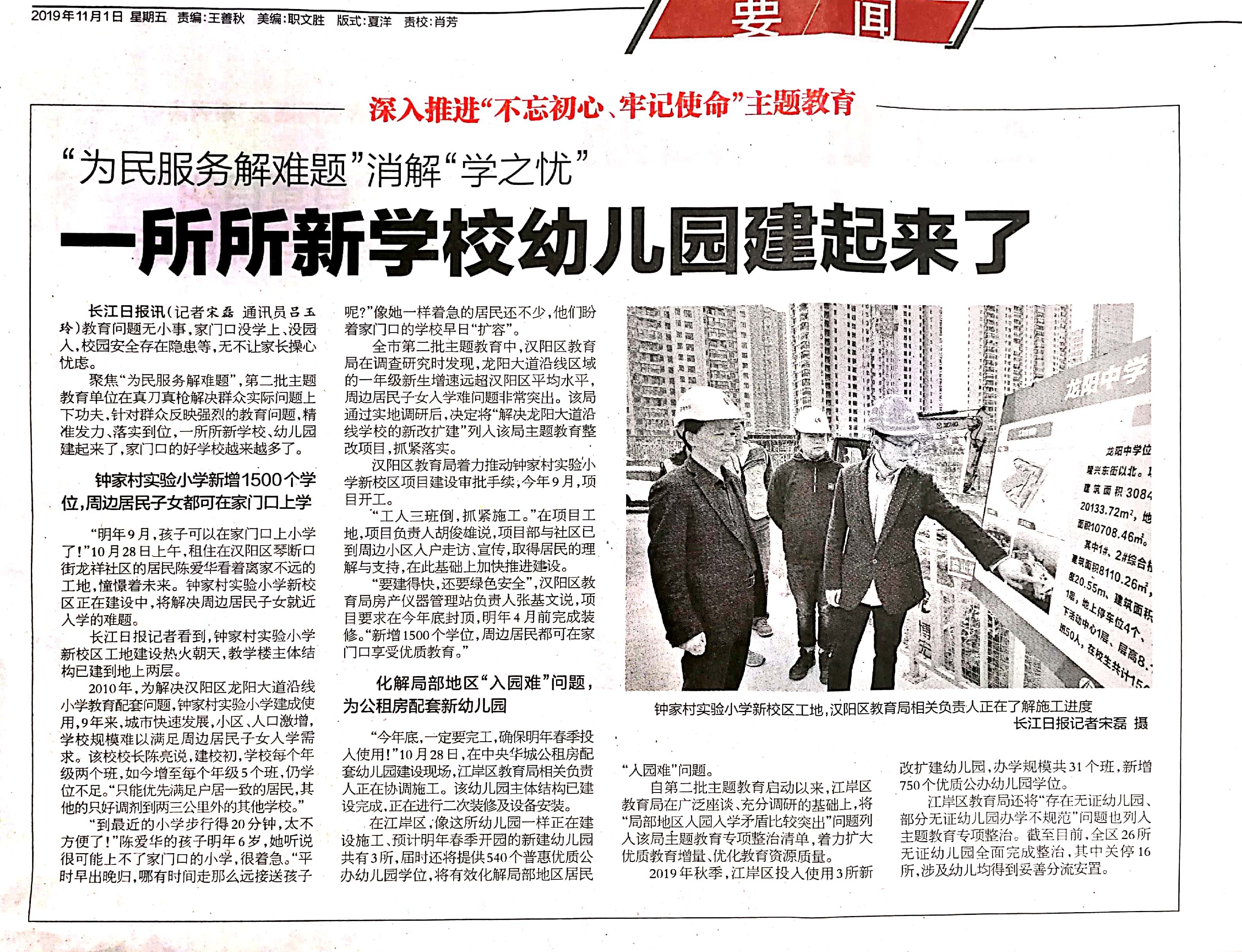 ?????????11月1日,《長江日報》以“‘為民服務(wù)解難題’消解‘學之憂’—一所所新學校幼兒園建起來了”為題,專題報道了龍陽中學項目(該項目建成后3—5年將作為鐘家村實驗小學新校區(qū)使用)的在建情況和建設(shè)意義。