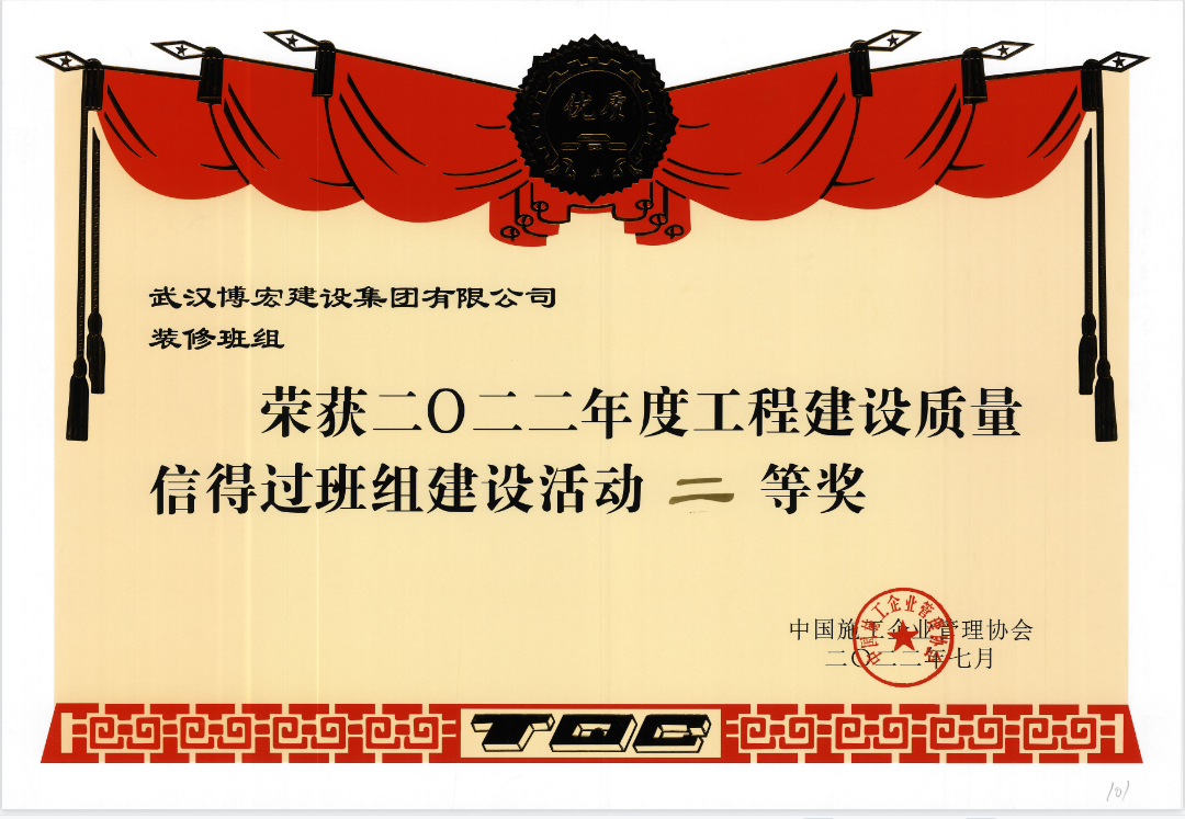 近日,博宏建設(shè)集團(tuán)裝修分公司榮獲中國施工企業(yè)管理協(xié)會(huì)頒發(fā)的2022年度工程建設(shè)質(zhì)量“信得過班組”建設(shè)活動(dòng)“二等獎(jiǎng)”以品質(zhì)工程,打造博宏品牌。