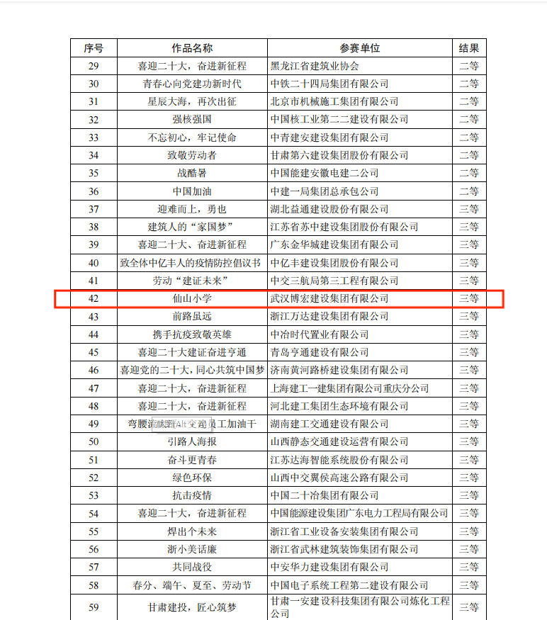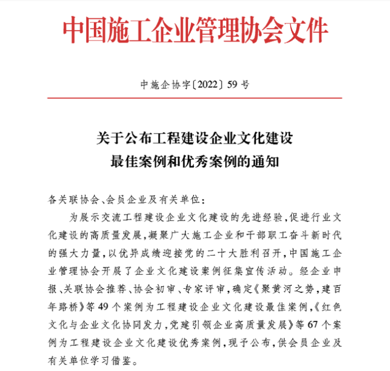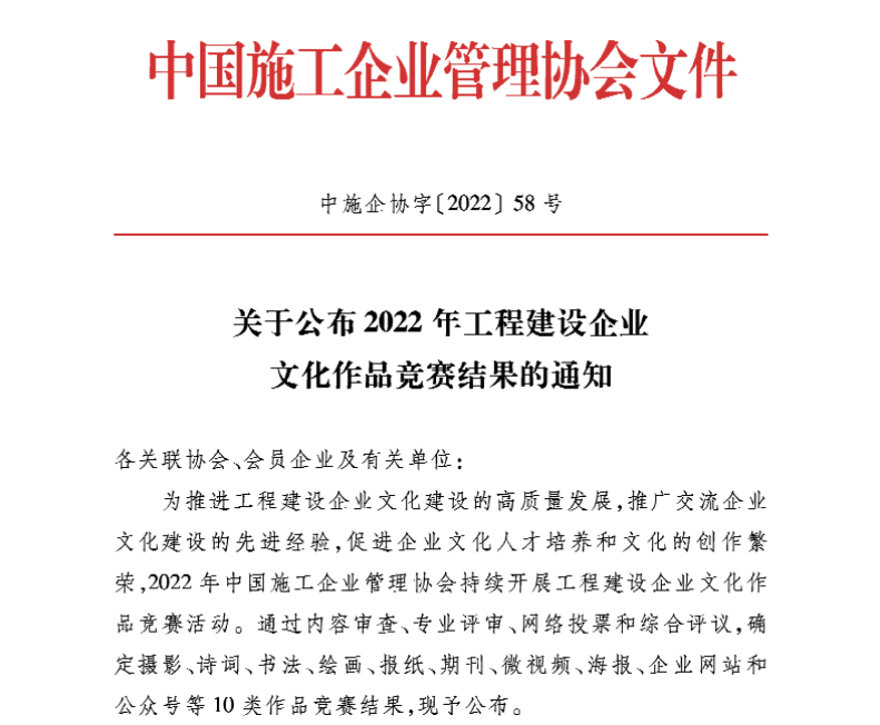 近日,中國施工企業(yè)管理協(xié)會發(fā)布“關于公布工程建設企業(yè)文化建設最佳案例和優(yōu)秀案例的通知”和“關于公布2022年工程建設企業(yè)文化作品競賽結果的通知”,經過內容審查、專業(yè)評審等環(huán)節(jié),博宏建設集團《創(chuàng)新企業(yè)文化建設 凝聚企業(yè)發(fā)展新動能》案例獲評工程建設企業(yè)文化建設優(yōu)秀案例;仙山小學海報獲評海報作品競賽單元三等獎。