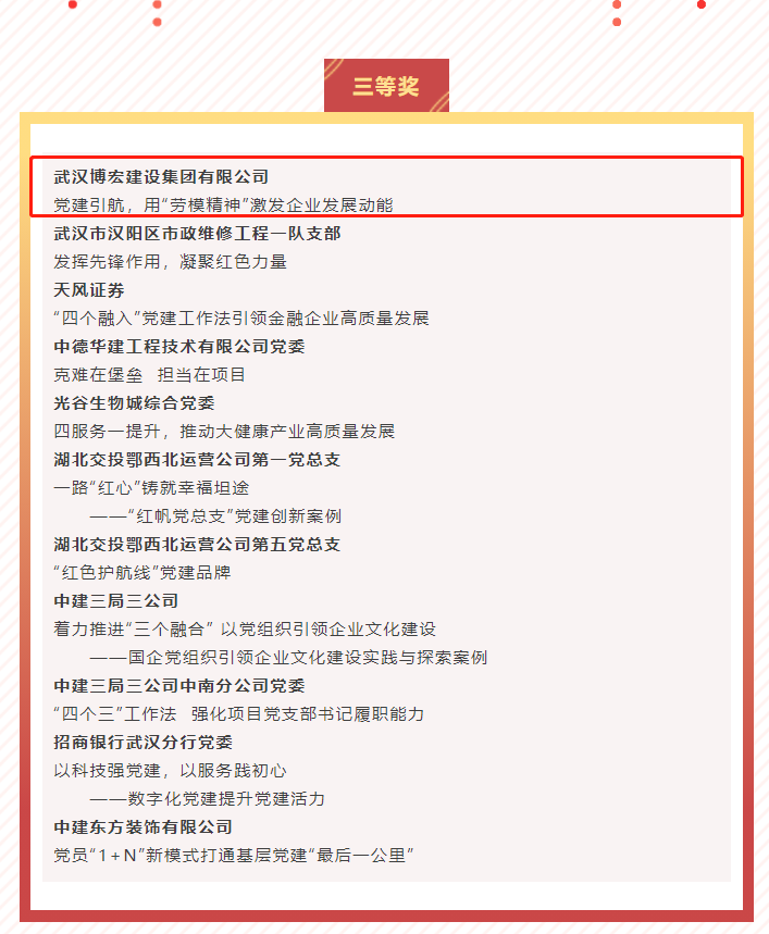 ? ? ? ?近日,首屆新時(shí)代企業(yè)黨建創(chuàng)新案例獲獎(jiǎng)名單公布,由博宏建設(shè)集團(tuán)推送的《黨建引航,用“勞模精神”激發(fā)企業(yè)發(fā)展動能》品牌案例斬獲黨建優(yōu)秀案例三等獎(jiǎng)。?該項(xiàng)活動由湖北省新時(shí)代文明實(shí)踐研究院、華中科技大學(xué)馬克思主義學(xué)院、華中科技大學(xué)黨的建設(shè)研究中心聯(lián)合紅艦智庫等機(jī)構(gòu)共同發(fā)起,博宏建設(shè)集團(tuán)推送的品牌案例在百余項(xiàng)案例中脫穎而出。