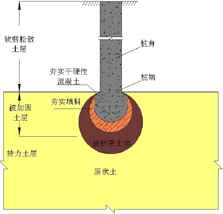 “載體樁”由上部樁身和下部“復(fù)合載體”兩部分組成。樁身一般為現(xiàn)澆鋼筋混凝土結(jié)構(gòu),“復(fù)合載體”是位于樁端底部、經(jīng)深層填料夯實的復(fù)合體。