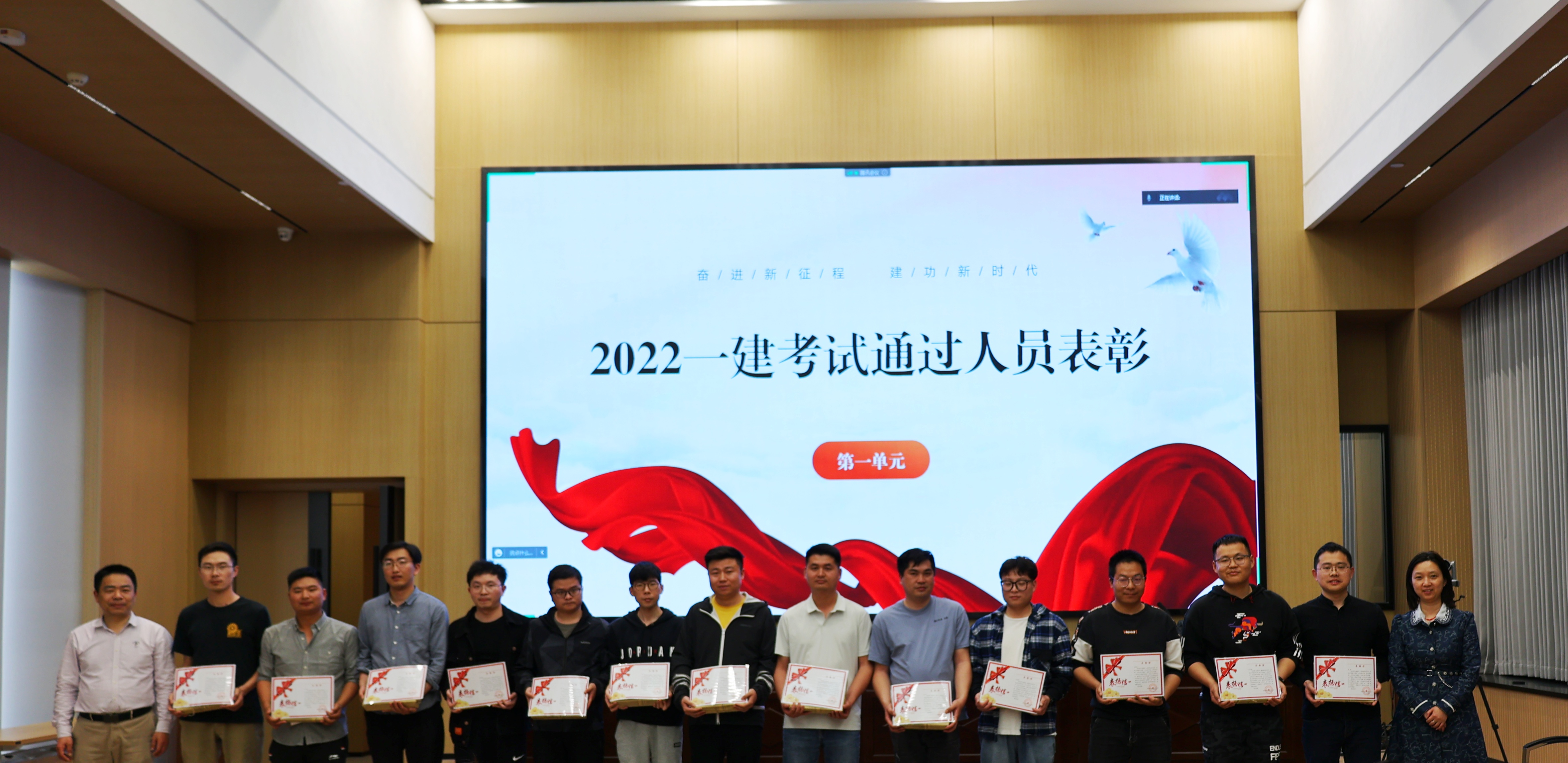 黨委副書記郭一清和本次合作培訓(xùn)機(jī)構(gòu)講師——鑫凌眾教育資深名師甘恢義老師為2022年度16名通過(guò)一建考試的學(xué)員頒發(fā)榮譽(yù)獎(jiǎng)品和表?yè)P(yáng)信。