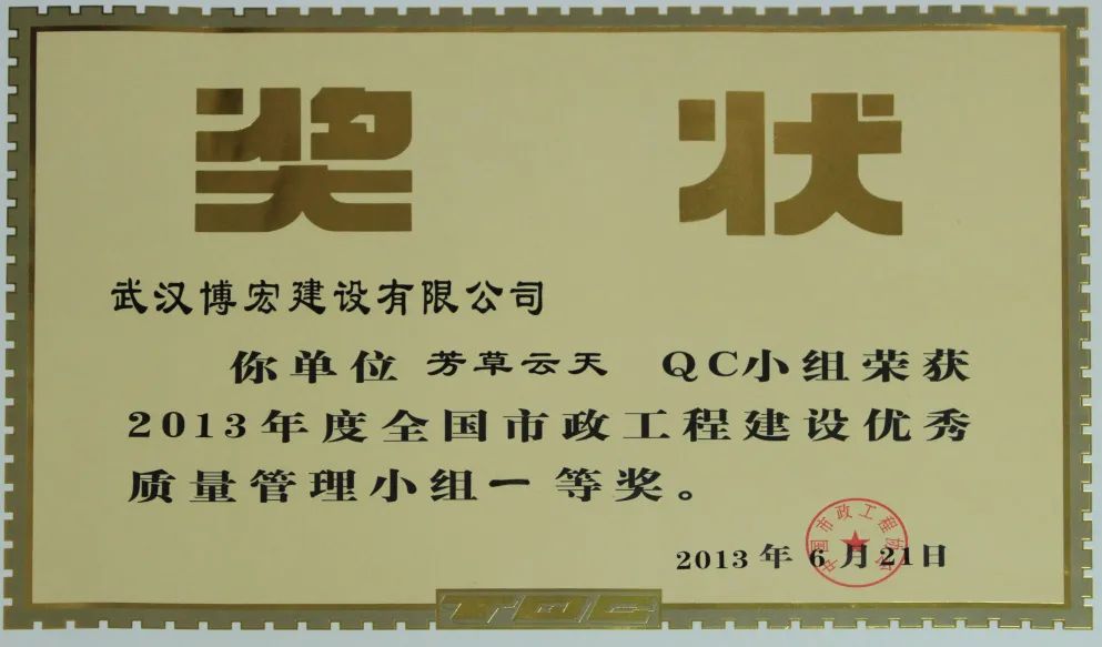 芳草云天QC小組成立于2011年5月31日,本小組從企業(yè)經(jīng)營(yíng)戰(zhàn)略、方針目標(biāo)和現(xiàn)場(chǎng)存在的問題出發(fā),以提高效能、降低消耗、實(shí)現(xiàn)經(jīng)濟(jì)與社會(huì)效益雙贏為目的,全面優(yōu)化項(xiàng)目質(zhì)量。歷年來追求卓越、探索新品,曾獲得2013 年全國(guó)市政工程建設(shè)協(xié)會(huì)優(yōu)秀QC成果一等獎(jiǎng)、2014年湖北省市政工程建設(shè)優(yōu)秀QC成果二等獎(jiǎng)、2015年湖北省市政工程建設(shè)優(yōu)秀 QC成果一等獎(jiǎng)、2022年度中國(guó)施工企業(yè)管理協(xié)會(huì)工程建設(shè)質(zhì)量管理小組活動(dòng)成果二等獎(jiǎng)、2022年中國(guó)建筑業(yè)工程建設(shè)質(zhì)量管理小組活動(dòng)成果三等獎(jiǎng)等榮譽(yù)。
