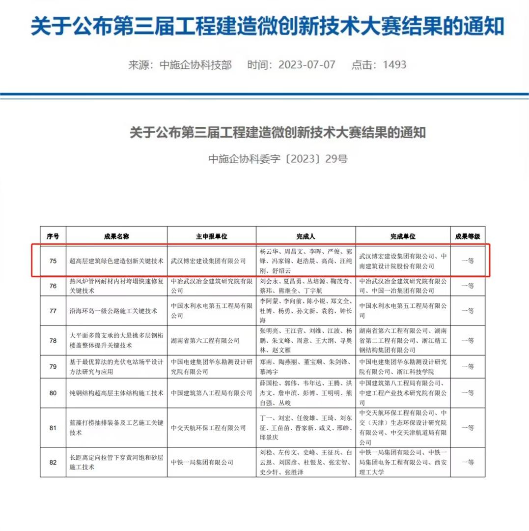 近日,中國施工企業(yè)管理協(xié)會公布第三屆工程建造微創(chuàng)新技術大賽獲獎結果。以中南科研設計中心建設項目為背景的“超高層建筑綠色建造創(chuàng)新關鍵技術”榮獲中施企協(xié)第三屆工程建造微創(chuàng)新技術大賽一等成果,這也是博宏建設集團首次獲得該類賽事一等獎。